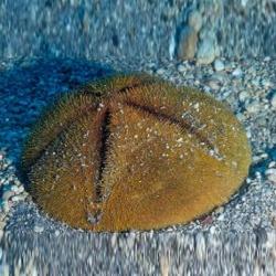 The Sea Biscuit is a large species of sea urchin which lives in shallow waters in the Caribbean. They have Reddish brown spines that cover it. They Feed on the algae that covers grains of sand as they submerge themselves into the sand.
