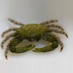 The Emerald Crab will feed on algae including bubble algae and eat any left-over meaty foods but, if it is underfed, may consume coral polyps or small fish. Research has shown that it can be used to control excessive growth of bubble algae in aquaria, but best results are found when its diet is supplemented with mysids but not with pelleted food.